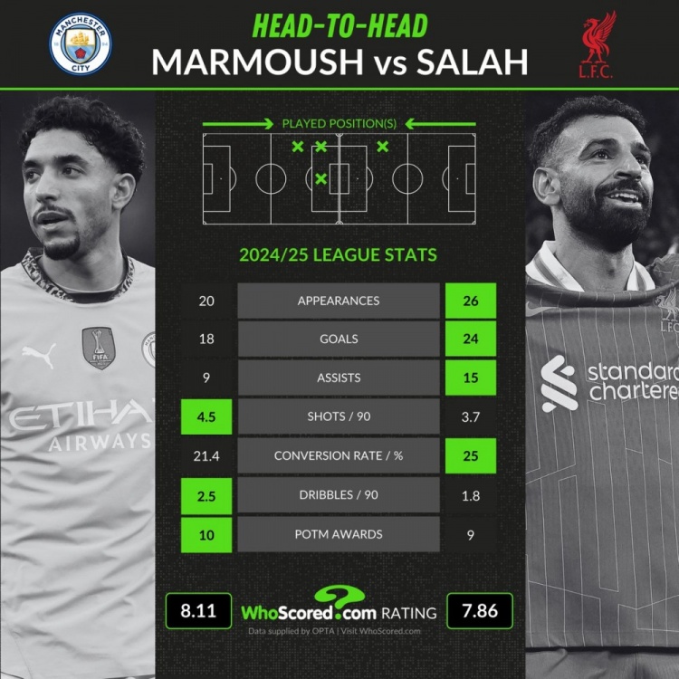 2月22日訊 曼城將在本輪英超焦點(diǎn)戰(zhàn)主場(chǎng)迎戰(zhàn)利物浦,馬爾穆什和薩拉赫將上演開(kāi)羅德比,whoscored也列出了兩人本賽季聯(lián)賽關(guān)鍵數(shù)據(jù)對(duì)比。