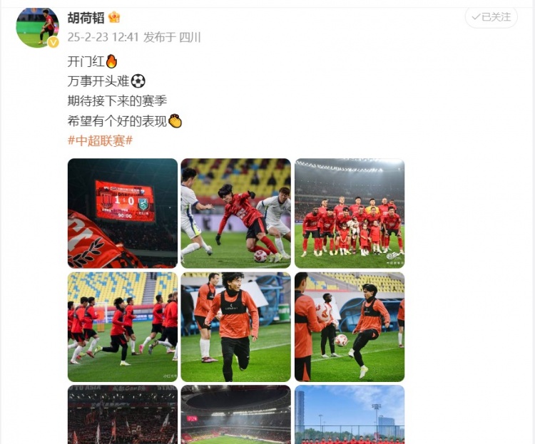 2月23日訊 中超聯(lián)賽首輪,成都蓉城主場1-0擊敗武漢三鎮(zhèn)。賽后,蓉城球員胡荷韜發(fā)文慶祝勝利。