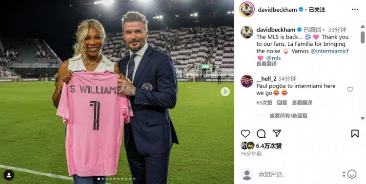 美國傳奇網(wǎng)球巨星小威廉姆斯也來到現(xiàn)場觀戰(zhàn),貝克漢姆贈與其1號球衣并合影留念。貝克漢姆也在個人社媒配文寫道:“美職聯(lián)比賽回歸了!感謝主場球迷的熱情支持,邁阿密國際加油!”
