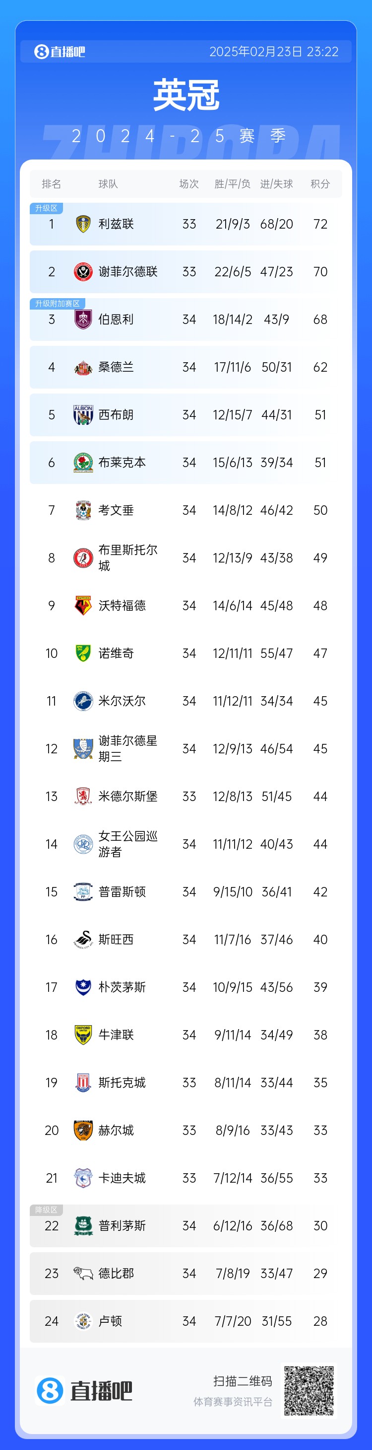 而其他2只降級球隊伯恩利和謝菲聯(lián)則在前列,他們都有希望爭奪直接升級英超的資格。