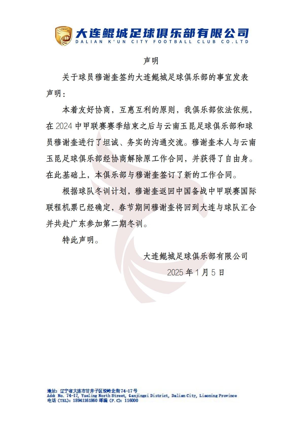 昨天,大連鯤城官方發(fā)布聲明解釋有關(guān)穆謝奎簽約的爭議問題,球隊表示穆謝奎本人與云南解約才自由身加盟球隊,并簽訂合同,球員將在春節(jié)期間回到大連與球隊匯合并參加冬訓(xùn)。