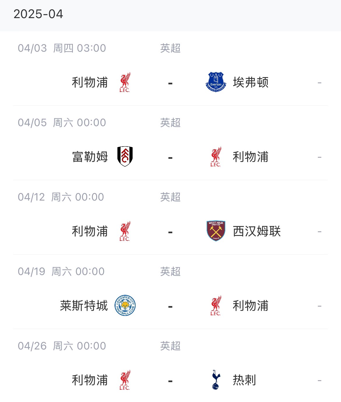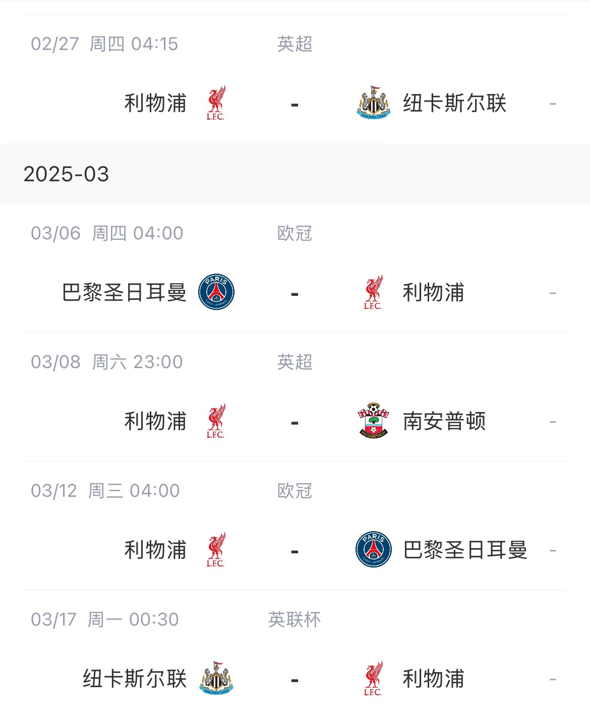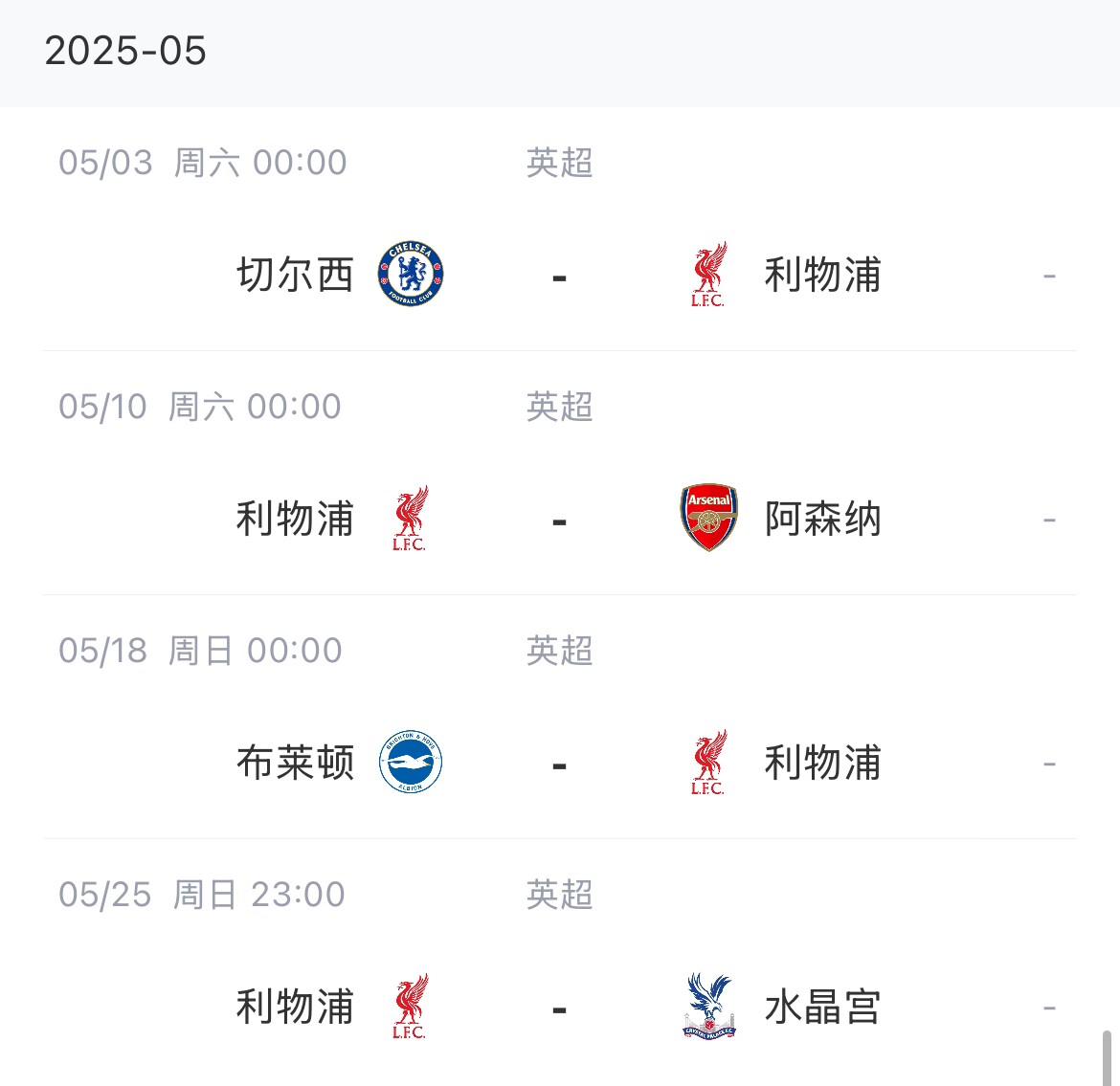 利物浦賽程: