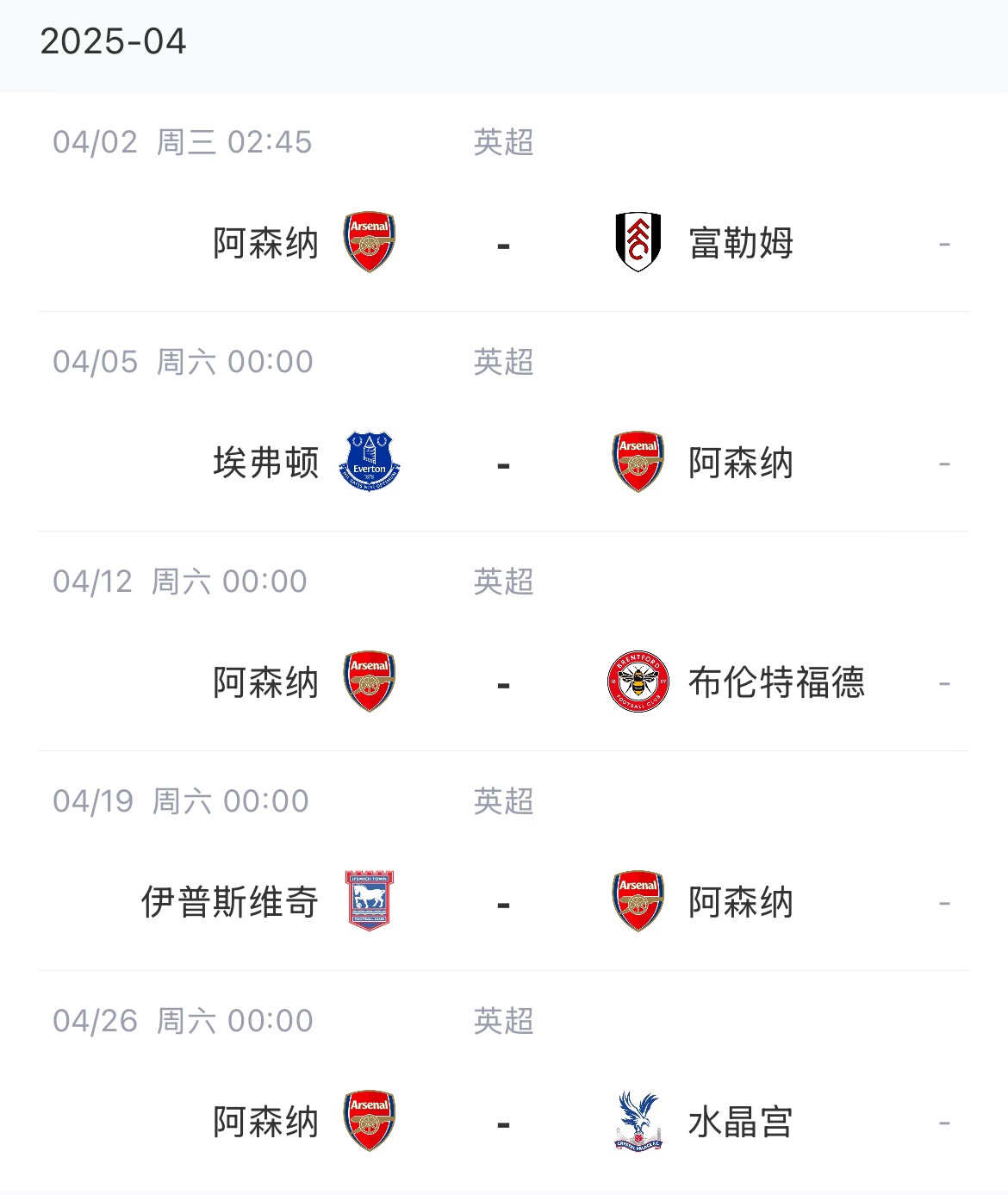 阿森納賽程: