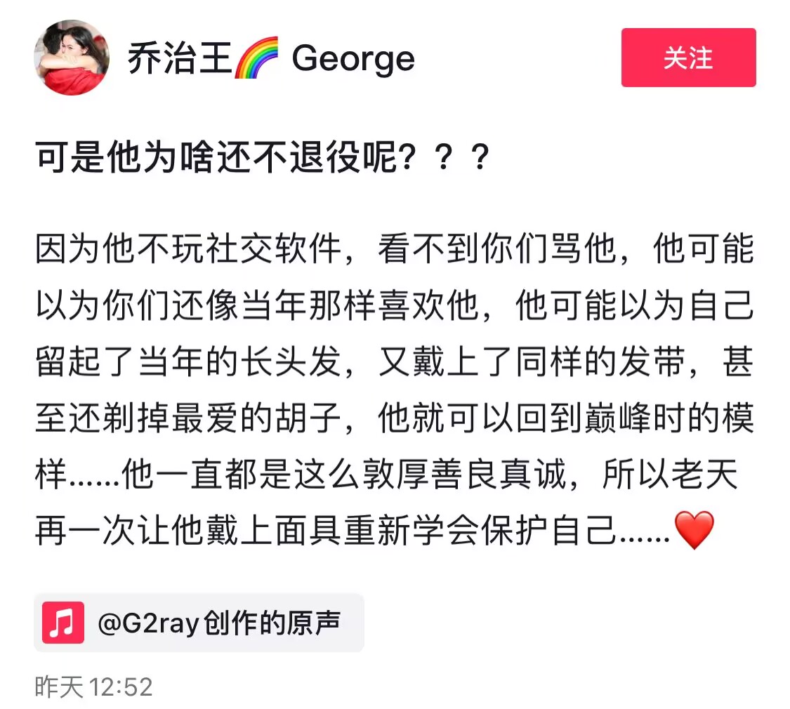 因?yàn)樗煌嫔缃卉浖?,看不到你們罵他,他可能以為你們還像當(dāng)年那樣喜歡他,他可能以為自己留起了當(dāng)年的長頭發(fā),又戴上了同樣的發(fā)帶,甚至還剃掉最愛的胡子,他就可以回到巔峰時(shí)的模樣…… 他一直都是這么敦厚善良真誠,所以老天再一次讓他戴上面具重新學(xué)會(huì)保護(hù)自己……?