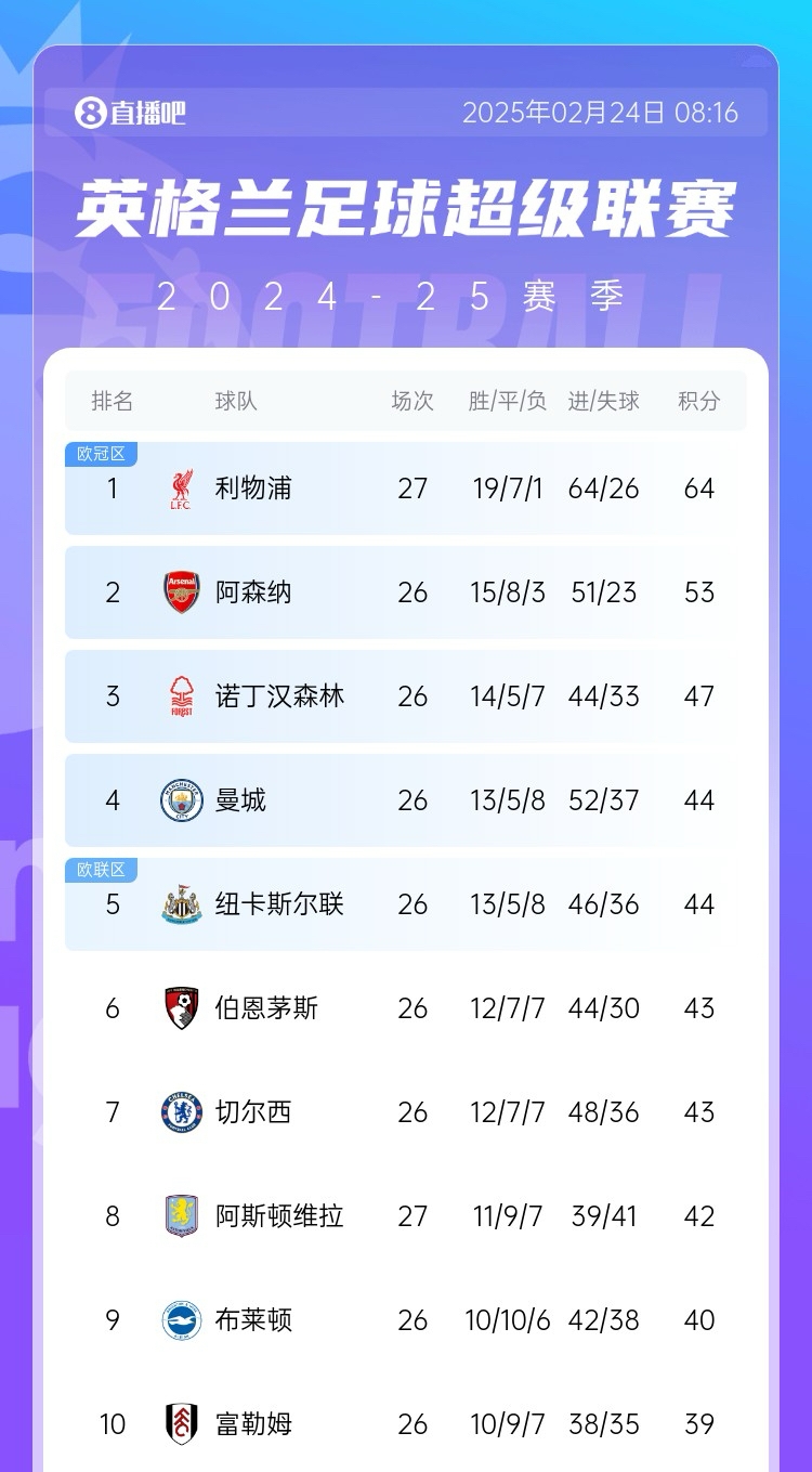 發(fā)布時(shí)間:2025年02月24日 08:50點(diǎn)擊:欄目:足球新聞 除特別注明外,本站所有內(nèi)容均為九球直播整理排版,轉(zhuǎn)載請(qǐng)注明出處:英超前四利物浦→曼城差20分而第4→第10僅差5分 本文標(biāo)簽: 足球 英超 話題 阿森納 利物浦 曼城 諾丁漢森林 紐卡斯?fàn)柭?lián) 伯恩茅斯 切爾西 阿斯頓維拉 布萊頓 富勒姆