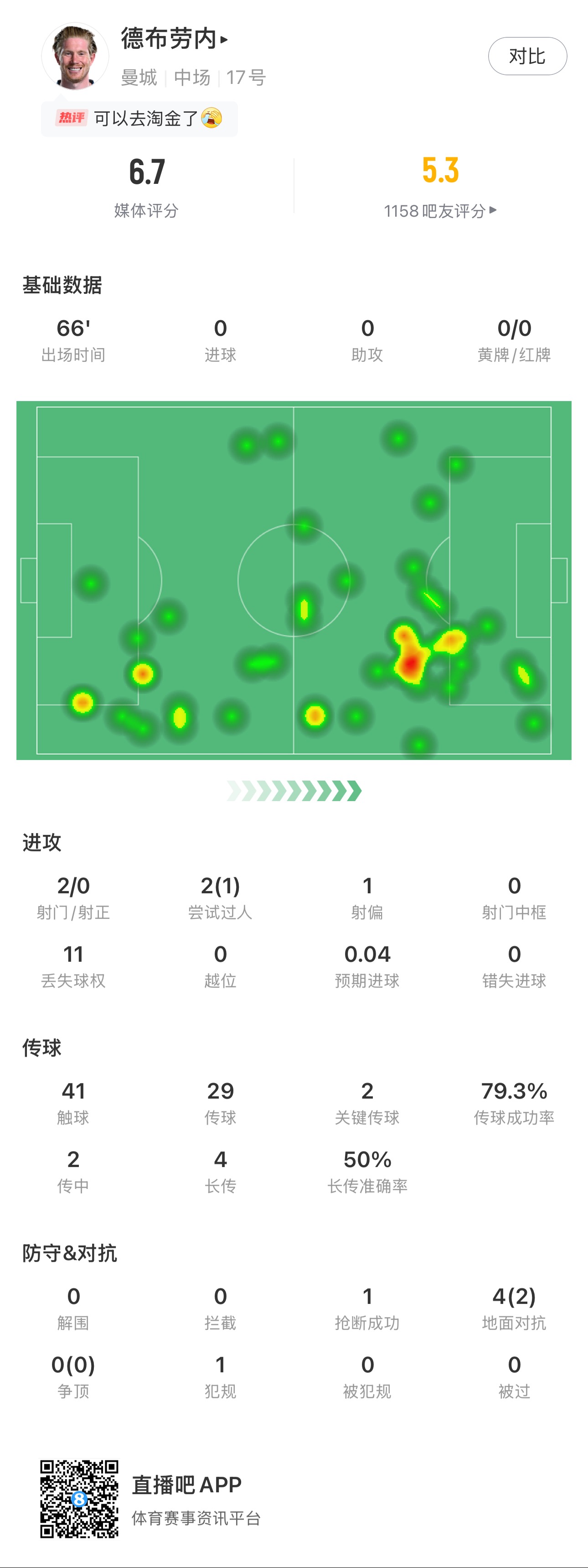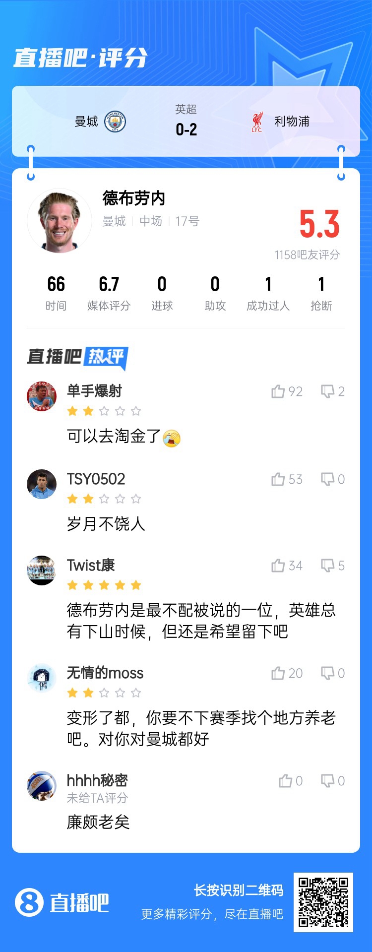 英超第26輪,曼城主場0-2遭利物浦雙殺,33歲德布勞內(nèi)下滑明顯,首發(fā)出戰(zhàn)66分鐘被換下。