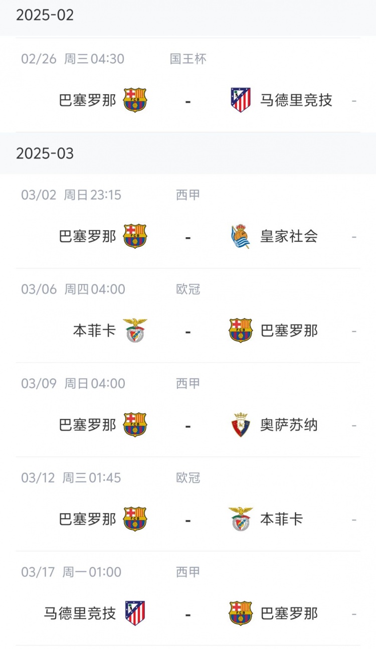 2月24日訊 未來三周,巴薩、皇馬和馬競將迎來一系列關(guān)鍵賽事?!睹咳阵w育報》報道,巴薩的賽程相對較為有利,六場比賽中將有四場主場作戰(zhàn)。