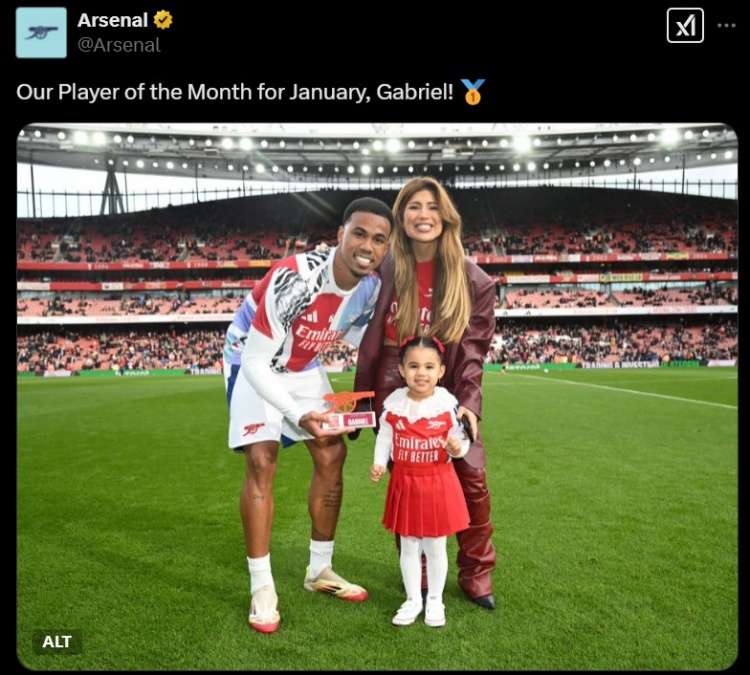2月24日訊 阿森納官方消息,加布里埃爾當(dāng)選球隊(duì)1月份最佳球員。球隊(duì)官推也曬出加布里埃爾與家人的合影,為其送上祝賀。