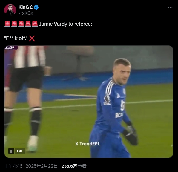 02月24日訊 在萊斯特城0-4不敵布倫特福德的比賽中,瓦爾迪在第22分鐘不滿裁判判罰,轉(zhuǎn)播鏡頭清晰地捕捉到瓦爾迪對(duì)著裁判罵了一句“Fxxk off”,裁判并無(wú)表示。