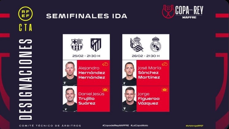 發(fā)布時間:2025年02月24日 18:50點擊:欄目:足球新聞 2月24日訊 國王杯半決賽首回合將在本周中打響,官方也公布了兩場比賽裁判組名單,具體如下:巴薩vs馬競裁判組:亞歷山大、埃爾南德斯、埃爾南德斯VAR裁判:丹尼爾-熱蘇斯、特魯西略、蘇亞雷斯皇家社會vs皇馬裁判組:何塞-馬里亞、桑切斯、馬丁內(nèi)斯VAR裁判:豪爾赫、費格羅阿、巴斯克斯 除特別注明外,本站所有內(nèi)容均為九球直播整理排版,轉載請注明出處:國王杯半決賽首回合裁判組公布:亞歷山大執(zhí)法巴薩vs馬競 本文標簽: 足球 西甲 皇家馬德里 巴塞羅那 馬德里競技