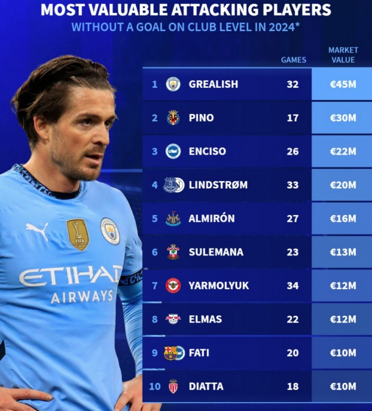 12月31日訊 《轉(zhuǎn)會(huì)市場》也統(tǒng)計(jì)了2024年為俱樂部打進(jìn)0球的攻擊手身價(jià)情況,格拉利什居首。