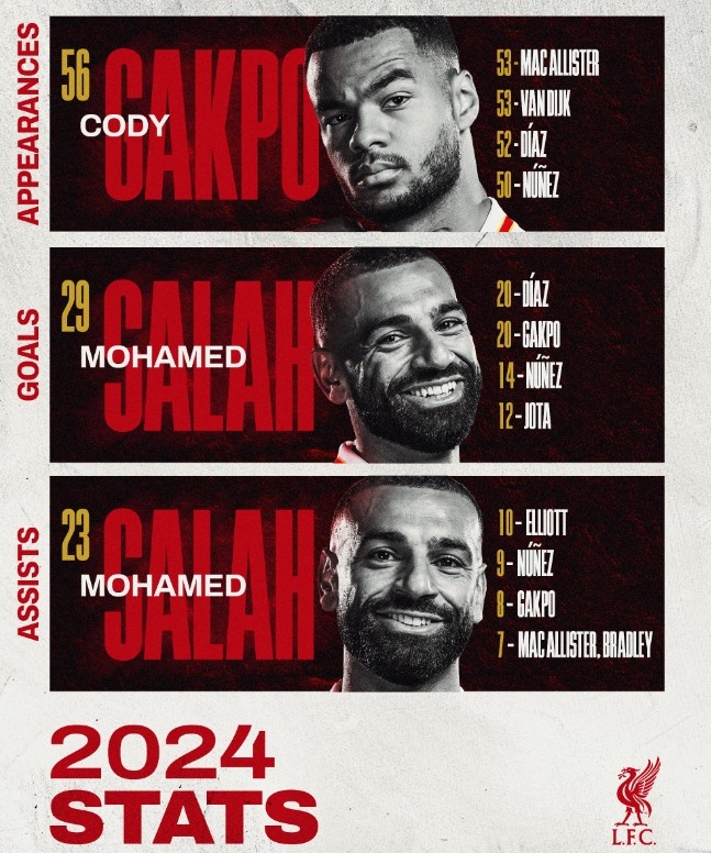 12月31日訊 2025年即將來臨之際,利物浦官方盤點(diǎn)了球隊(duì)2024年的一些數(shù)據(jù),其中加克波成為紅軍出勤王,薩拉赫在進(jìn)球和助攻方面都位居隊(duì)內(nèi)榜首。