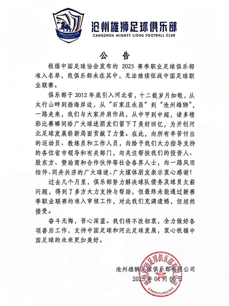 發(fā)布時間:2025年01月06日 15:50點擊:欄目:足球新聞 除特別注明外,本站所有內容均為九球直播整理排版,轉載請注明出處:還記得在鷹潭點球戰(zhàn)勝貴州隊的福建駿豪嗎 本文標簽: 中超 中國足球 滄州雄獅 足球 轉載
