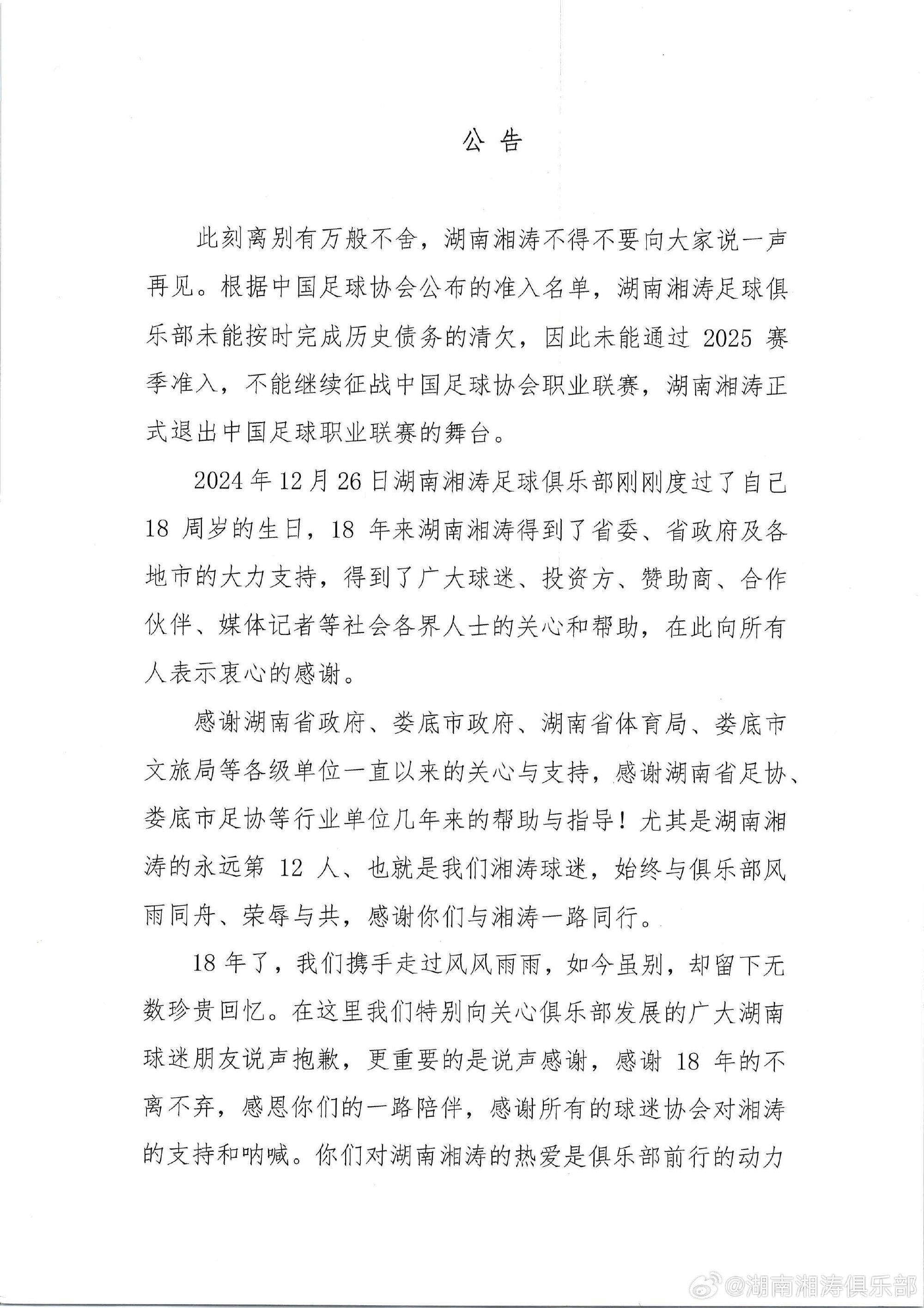 - 2006-2025!湖南湘濤官方:正式退出中國足球職業(yè)聯(lián)賽舞臺