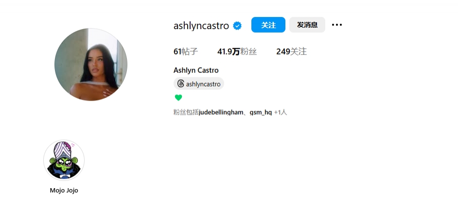 戀情曝光以來,Ashlyn Castro已經(jīng)漲粉27.8萬。