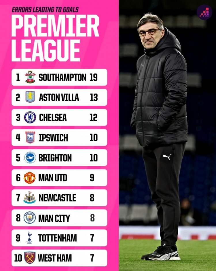 除特別注明外,本站所有內(nèi)容均為九球直播整理排版,轉(zhuǎn)載請注明出處:南安普頓本賽季因失誤丟掉19球英超最多,比第二名維拉多出6球