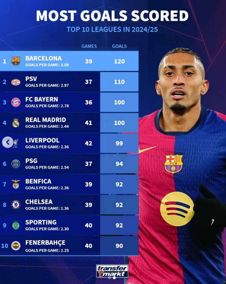 2月26日訊 德轉(zhuǎn)盤點(diǎn)了本賽季歐洲前十聯(lián)賽球隊(duì)各項(xiàng)賽事進(jìn)球榜,其中巴薩39場120球居首,以下為具體榜單: