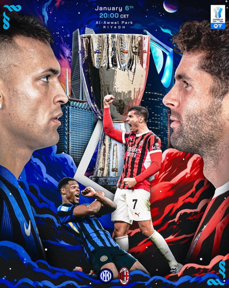 1月6日訊 北京時(shí)間明天凌晨3:00意超杯決賽,國(guó)米將和米蘭角逐冠軍。賽前,意甲官方曬出海報(bào),預(yù)熱這場(chǎng)焦點(diǎn)德比大戰(zhàn)。