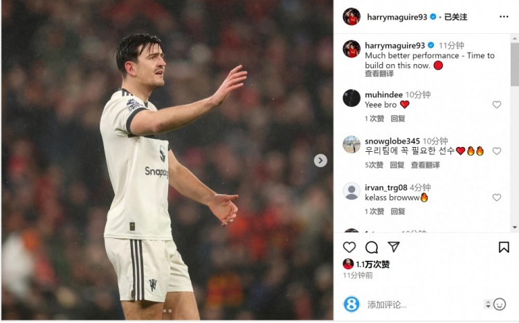 馬奎爾在社交媒體上曬出自己的比賽照片,配文:“表現(xiàn)提升很多——現(xiàn)在是時候以此為基礎再接再厲了?!?/p>