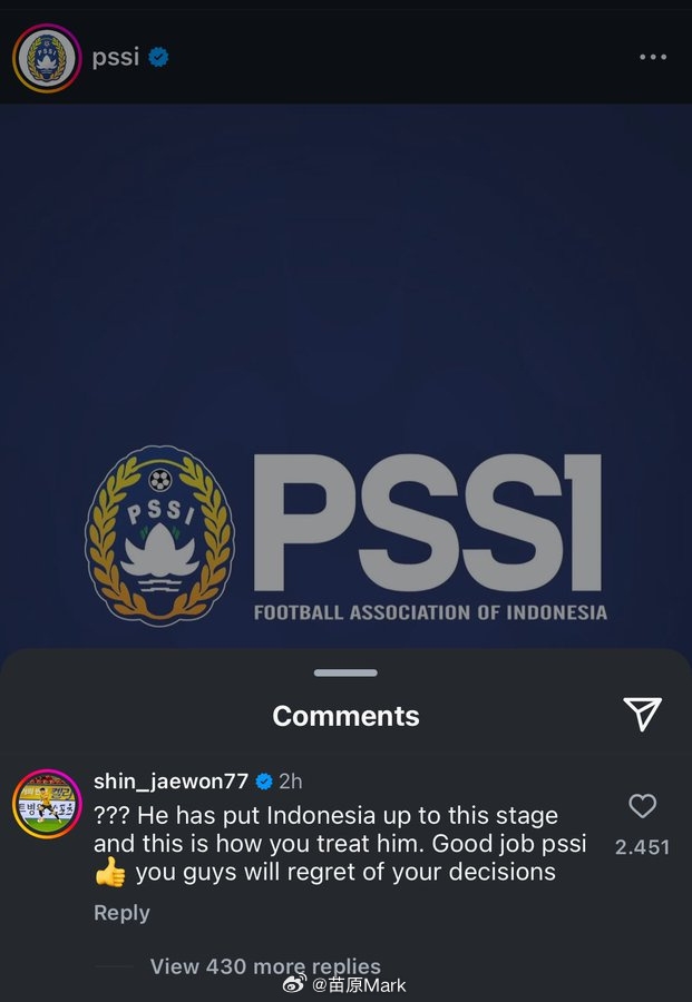 隨后申載沅在印尼足協(xié)官方賬號下留言:“???他把印度尼西亞推到了這個階段,這就是你們對待他的方式。干得漂亮,你們會后悔做出這個決定的?!?/p>