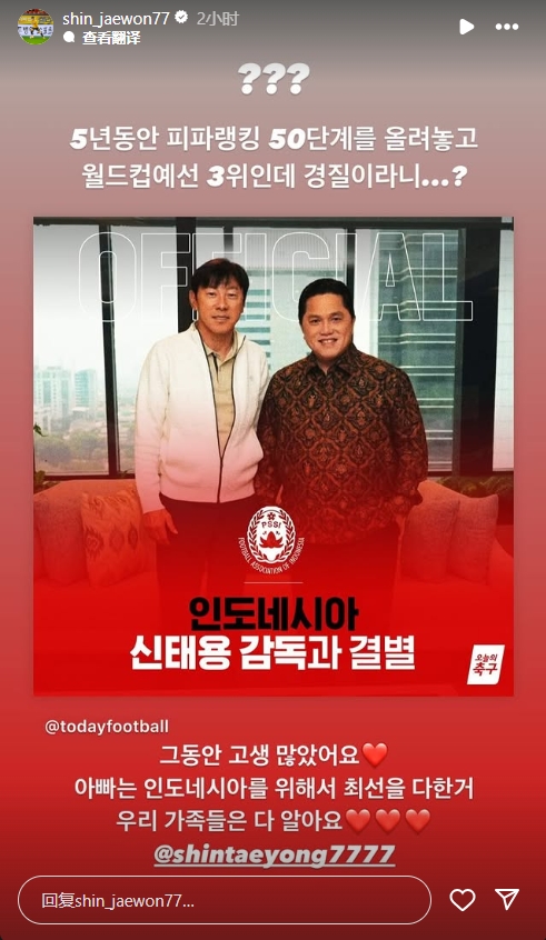 1月6日訊 印尼足協(xié)官方此前宣布,申臺龍不再擔任印尼國家隊、U23國家隊主帥。申臺龍的兒子申載沅在社媒中表達了自己對此事的不滿。