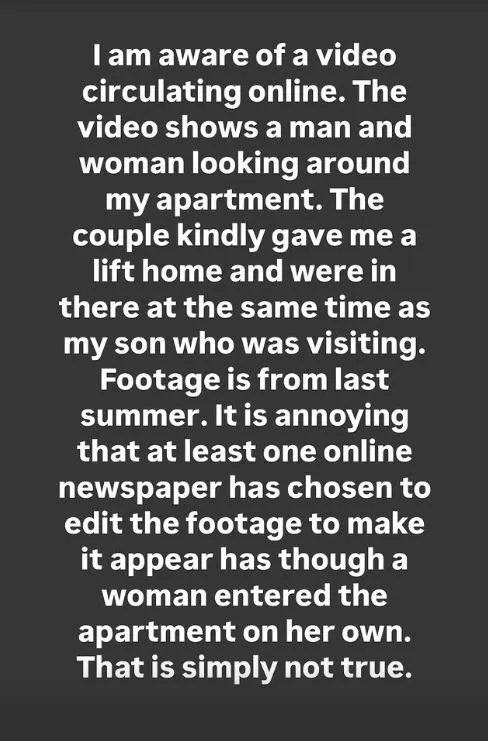 魯尼在他的Instagram上稱:“我知道網(wǎng)上流傳著一個(gè)視頻。視頻顯示一男一女在我的公寓里四處張望。那對夫婦好心地讓我搭便車回家,我兒子也在。視頻來自去年夏天,令人惱火的是,至少有一家在線報(bào)紙選擇再次編輯視頻,使其看起來像是一名女子獨(dú)自進(jìn)入公寓,這根本不是真的?!?/p>
