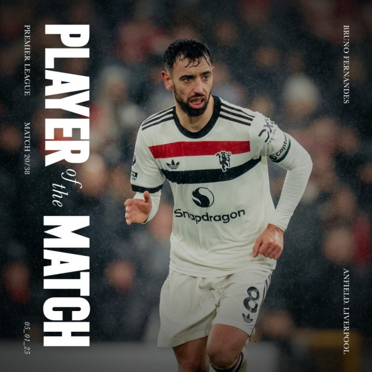 此役B費(fèi)為曼聯(lián)踢滿全場(chǎng),并助攻利桑德羅破門。曼聯(lián)官方曬出海報(bào),宣布B費(fèi)當(dāng)選本場(chǎng)比賽曼聯(lián)隊(duì)內(nèi)最佳球員。