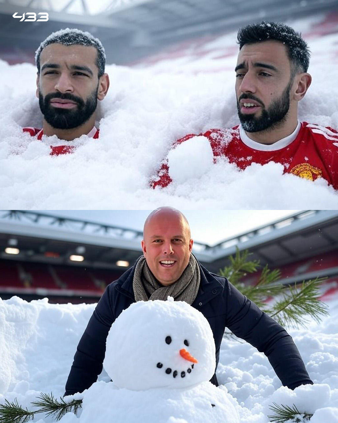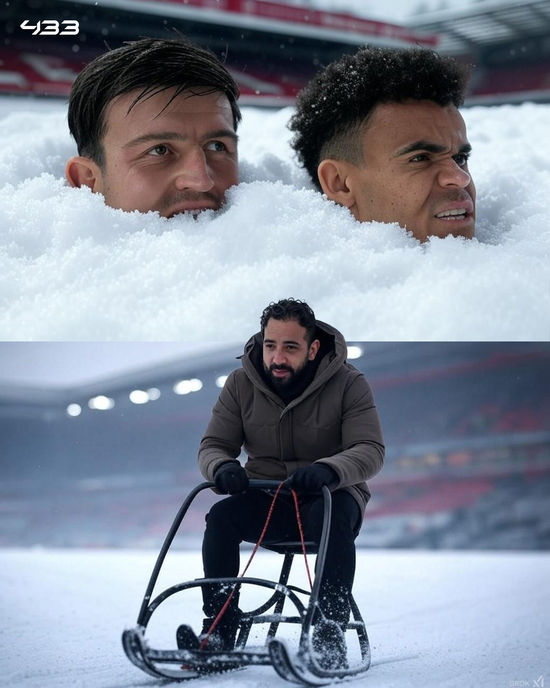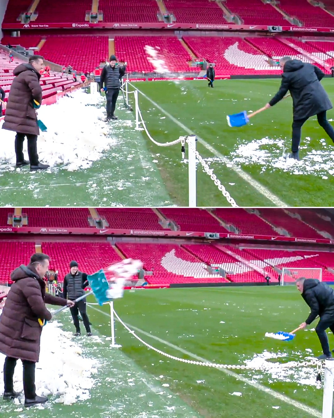賽前卡拉格奮力清除場(chǎng)內(nèi)積雪,內(nèi)維爾反向鏟雪