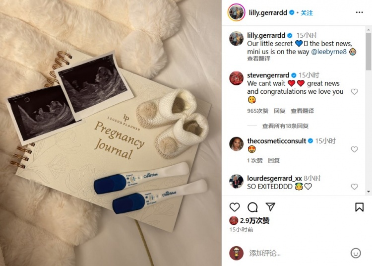 在女兒的動態(tài)下,杰拉德評論道:“我們等不及了!這消息太棒了!恭喜你!我們愛你!”