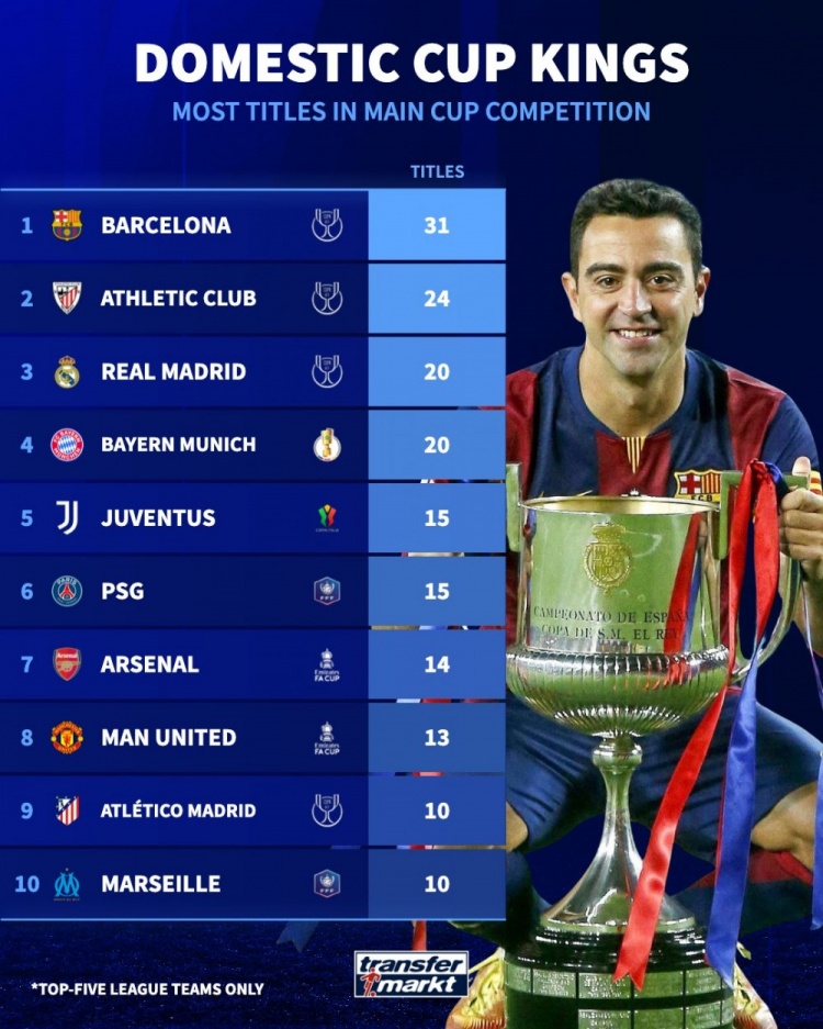 2月28日訊 五大聯(lián)賽的國(guó)內(nèi)杯賽淘汰賽本周進(jìn)行中,德轉(zhuǎn)列出了五大聯(lián)賽國(guó)內(nèi)杯賽奪冠次數(shù)榜單,巴薩31次排名第一,畢巴24次排名第二。