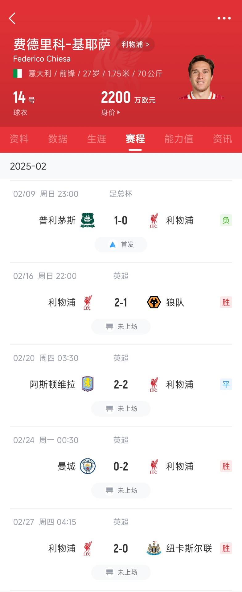 02月28日訊 英超第27輪利物浦2-0紐卡斯?fàn)?,本?chǎng)比賽基耶薩繼續(xù)坐板凳,已連續(xù)4輪英超枯坐替補(bǔ)席。