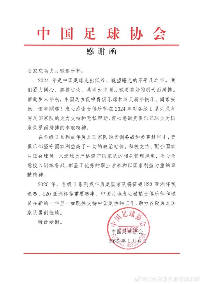 2025年1月6日,中國足球協(xié)會(huì)向石家莊功夫足球俱樂部致感謝函,對俱樂部在2024年度對各級U系列成年男足國家隊(duì)的支持和幫助表示感謝。