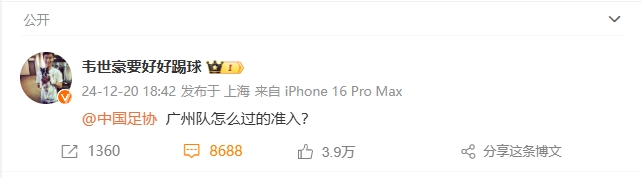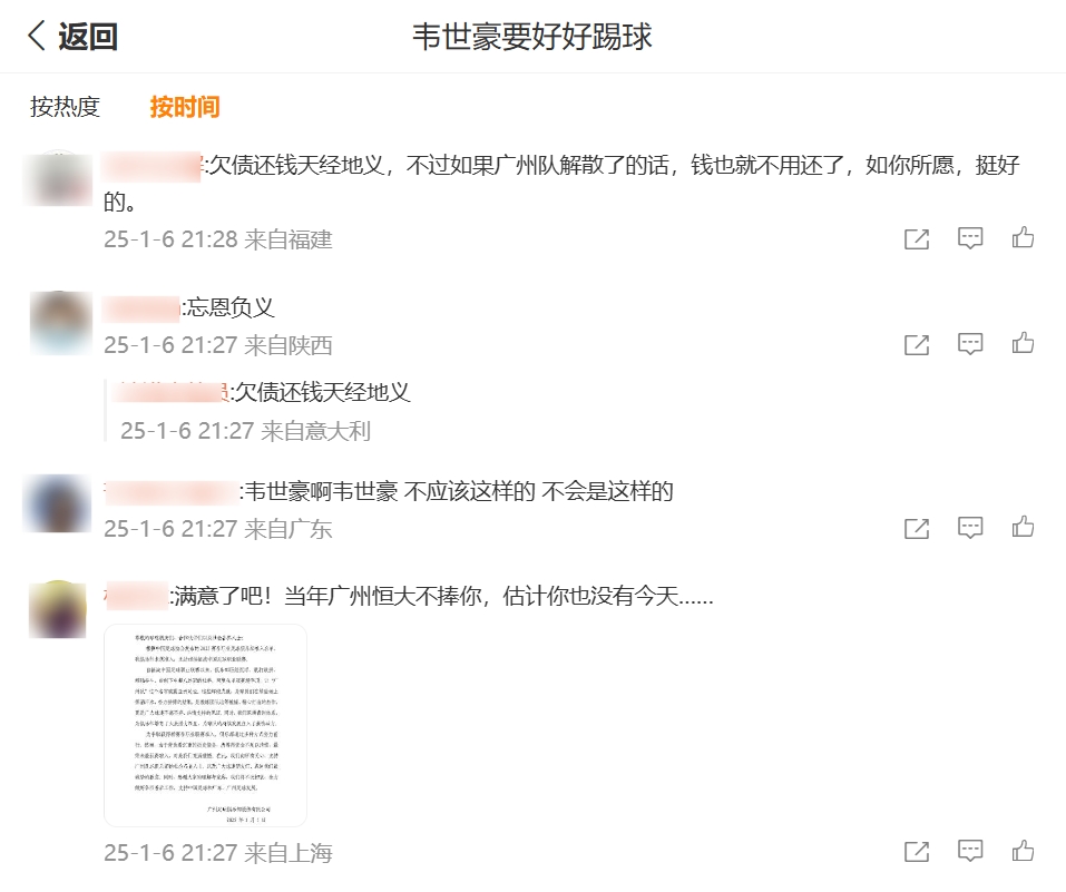 01月06日訊 今日廣州隊(duì)官方發(fā)布公告,稱無法繼續(xù)征戰(zhàn)中國職業(yè)足球聯(lián)賽。此消息一出,有部分廣州隊(duì)球迷涌入韋世豪社媒下,對(duì)其進(jìn)行攻擊。