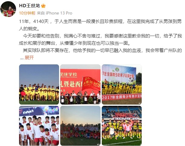 王世龍?jiān)谏缑綄懙溃骸?1年,4140天 ,于人生而言是一段漫長(zhǎng)且珍貴旅程,在這里我完成了從男孩到男人的蛻變。 今天卻要和他告別,我滿心不舍與難過,我要感謝這里教會(huì)我的一切,給予了我成長(zhǎng)和展示的舞臺(tái),從懵懂少年到現(xiàn)在也可以獨(dú)當(dāng)一面?!?/p>