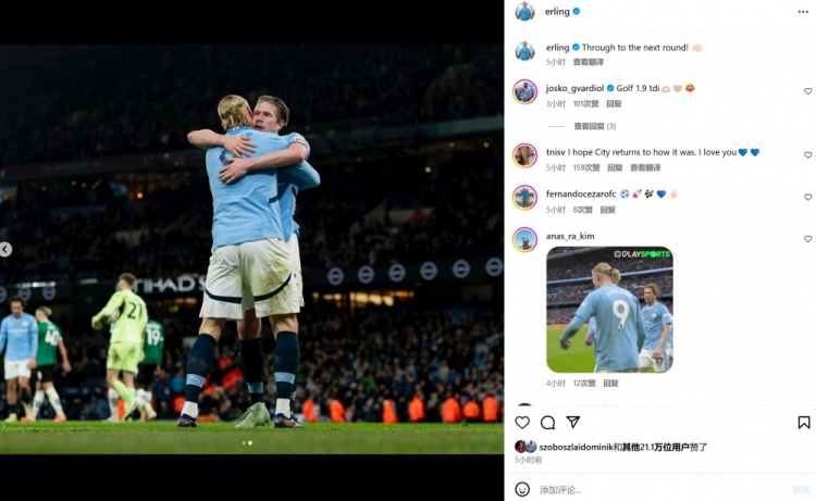 本場(chǎng)比賽哈蘭德助攻德布勞內(nèi)破門,賽后哈蘭德也在個(gè)人社媒曬出與德布勞內(nèi)相擁慶祝的照片,配文寫道:“晉級(jí)足總杯 下一輪!”