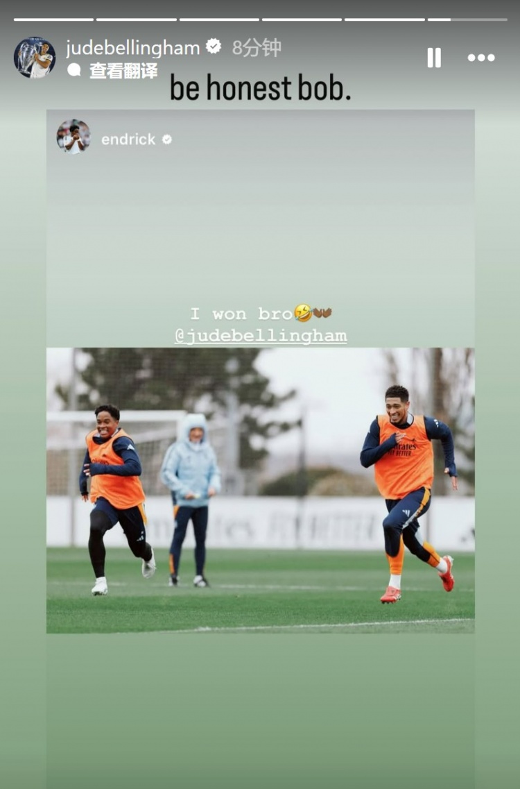 恩德里克曬出自己和貝林厄姆賽跑的照片,并調(diào)侃道:“兄弟,我贏了?!必惲只卮鹚骸罢\(chéng)實(shí)點(diǎn),小老弟?!?/p>