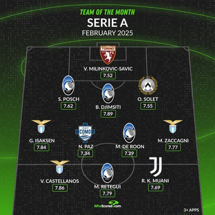 中場:古斯塔夫-伊薩克森(拉齊奧,7.84分)、帕斯(科莫,7.34分)、德容恩(亞特蘭大,7.29分)、扎卡尼(拉齊奧,7.77分)