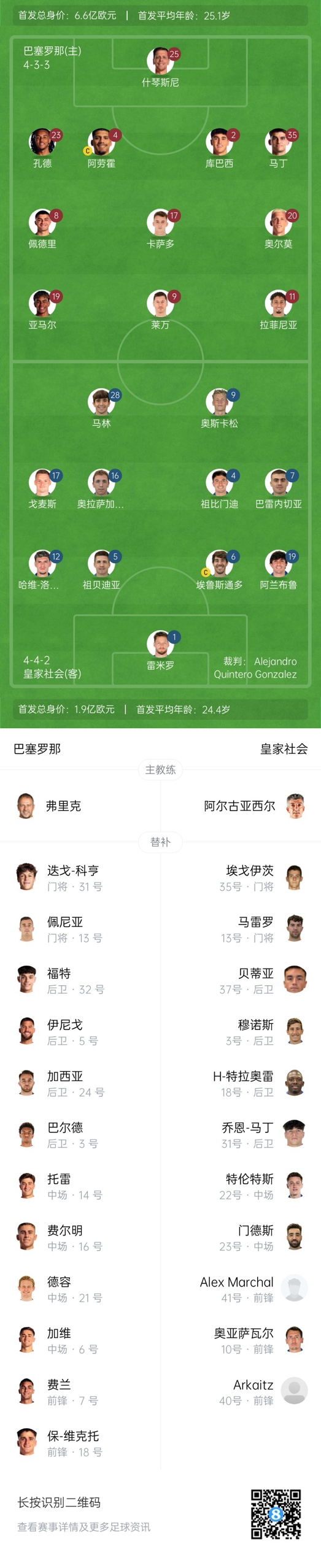 巴薩首發(fā):25-什琴斯尼、2-庫巴西、4-阿勞霍、23-孔德、35-杰拉德-馬丁、8-佩德里、17-卡薩多、11-拉菲尼亞、19-亞馬爾、20-奧爾莫、9-萊萬