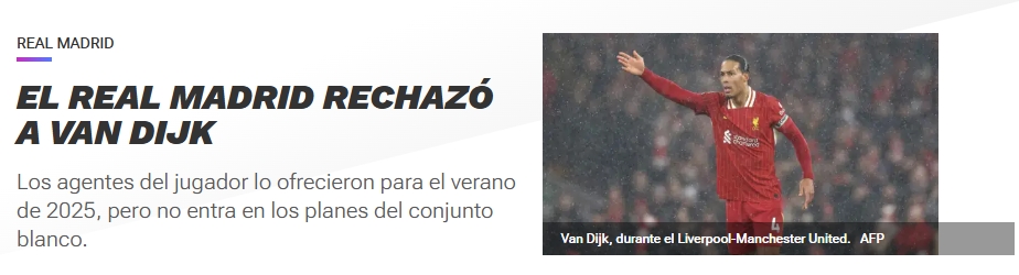 據(jù)relevo了解,范迪克的經(jīng)紀(jì)人聯(lián)系了皇馬,告知他們球員愿意在2025年夏天自由身加盟球隊(duì),但這項(xiàng)提議遭到皇馬拒絕。盡管范迪克可以自由身來(lái)投,他在本賽季在利物浦的表現(xiàn)也很出色,但皇馬還是決定拒絕,轉(zhuǎn)而尋找更適合他們的球員?,F(xiàn)在范迪克即將和利物浦續(xù)約。雖然這對(duì)皇馬來(lái)說(shuō)是一個(gè)誘人的選擇,但由于年齡和條件問(wèn)題并未被考慮進(jìn)來(lái)。