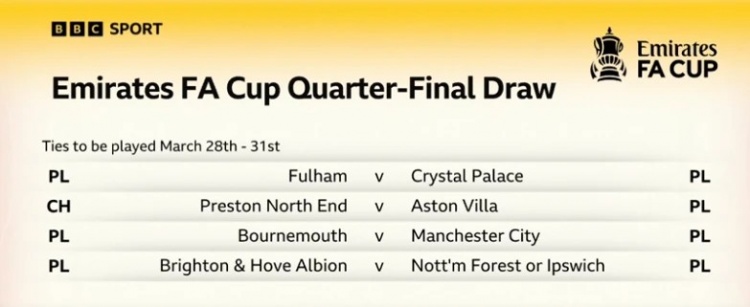 發(fā)布時間:2025年03月03日 03:50點擊:欄目:足球新聞 3月3日訊 曼聯(lián)在本輪足總杯被富勒姆點球淘汰,足總杯八強也僅剩一個席位。足總杯八強對陣如下:富勒姆vs水晶宮普雷斯頓(英冠)vs阿斯頓維拉伯恩茅斯vs曼城布萊頓vs(諾丁漢森林vs伊普斯維奇的勝者) 除特別注明外,本站所有內(nèi)容均為九球直播整理排版,轉(zhuǎn)載請注明出處:足總杯八強對陣:曼城客戰(zhàn)伯恩茅斯,維拉客戰(zhàn)普雷斯頓 本文標簽: 足球 英超 曼城 水晶宮 富勒姆 伯恩茅斯 布萊頓 諾丁漢森林 伊普斯維奇