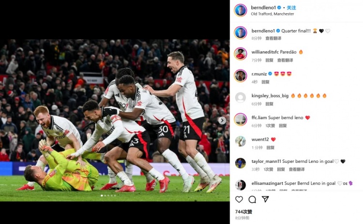 萊諾也在賽后通過社媒曬出自己被隊友們簇?fù)淼膽c祝照,并配文:“晉級八強(qiáng)戰(zhàn)!”