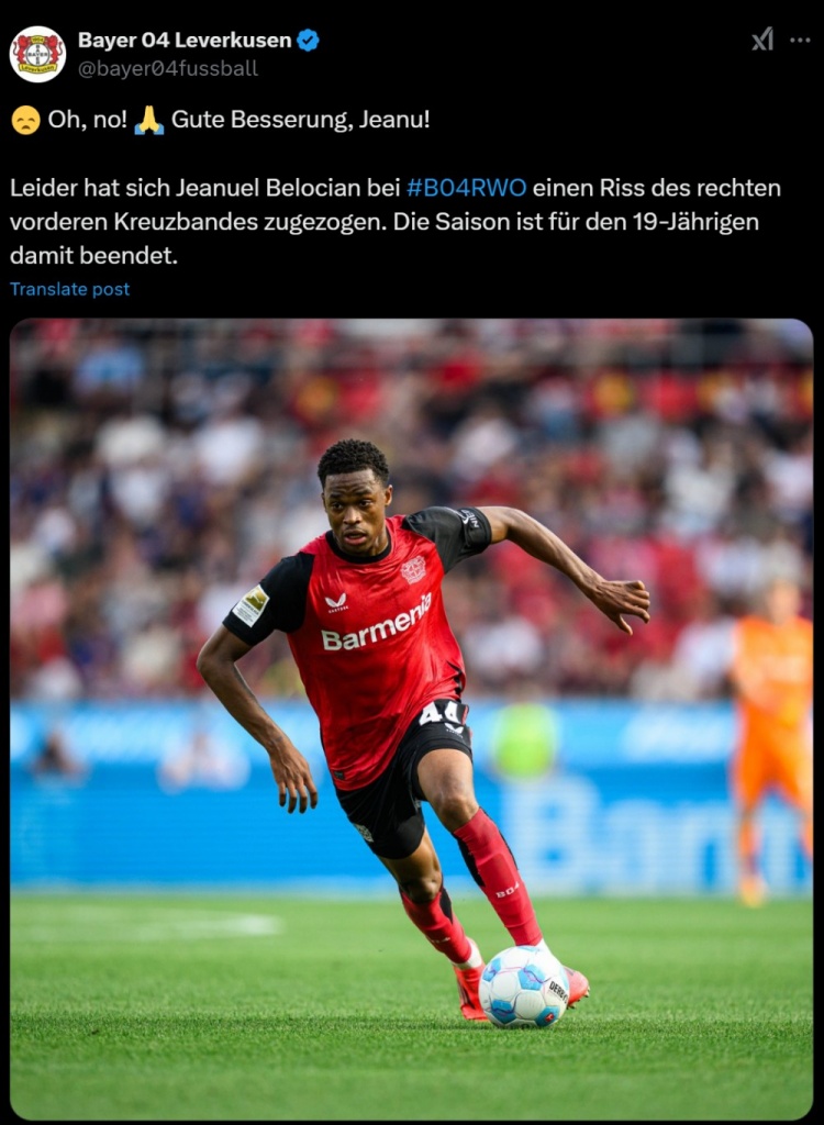 1月7日訊 勒沃庫森官方確認,19歲后衛(wèi)貝洛西安右前十字韌帶撕裂,賽季提前報銷。
