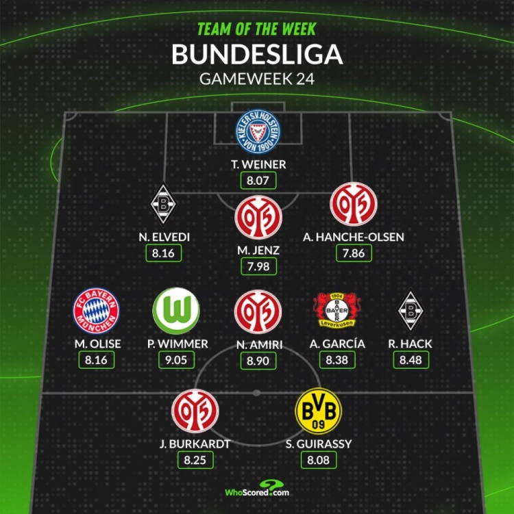3月3日訊 德甲第24輪聯(lián)賽已經(jīng)完賽,whoscored也統(tǒng)計了本輪德甲評分最佳陣容,美因茨成為最大贏家。