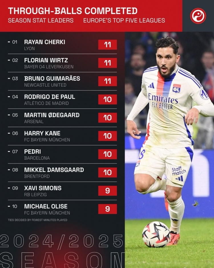 3月3日訊 squawka統(tǒng)計了本賽季五大聯(lián)賽送出精準直塞球次數(shù)情況,維爾茨并列居首。