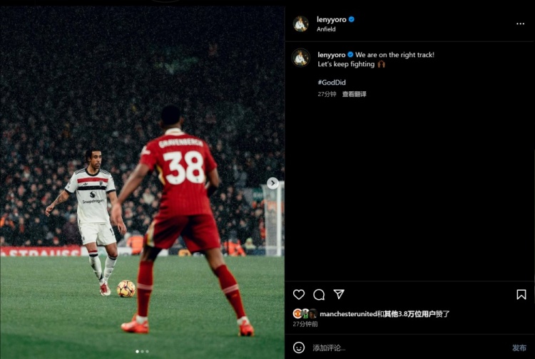 1月7日訊 本輪英超焦點戰(zhàn),曼聯(lián)客場2-2戰(zhàn)平利物浦。約羅在第83分鐘替補登場。賽后,他更新了社交媒體,激勵球隊。