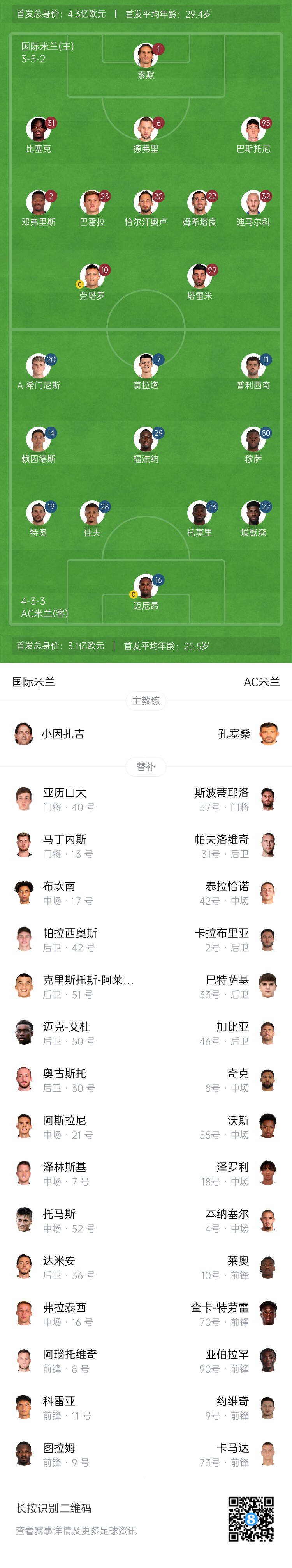 1月7日訊 意大利超級杯決賽,國米對陣米蘭,賽前首發(fā)公布。