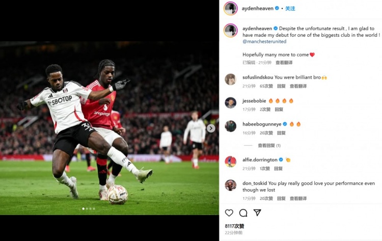 他也在賽后通過社媒曬出自己的比賽照,并配文:“盡管結(jié)果并不理想,但我很高興能夠?yàn)檫@家世界最大俱樂部之一完成首秀。@曼徹斯特聯(lián)俱樂部,希望未來能夠有更多出場機(jī)會(huì)?!?/p>