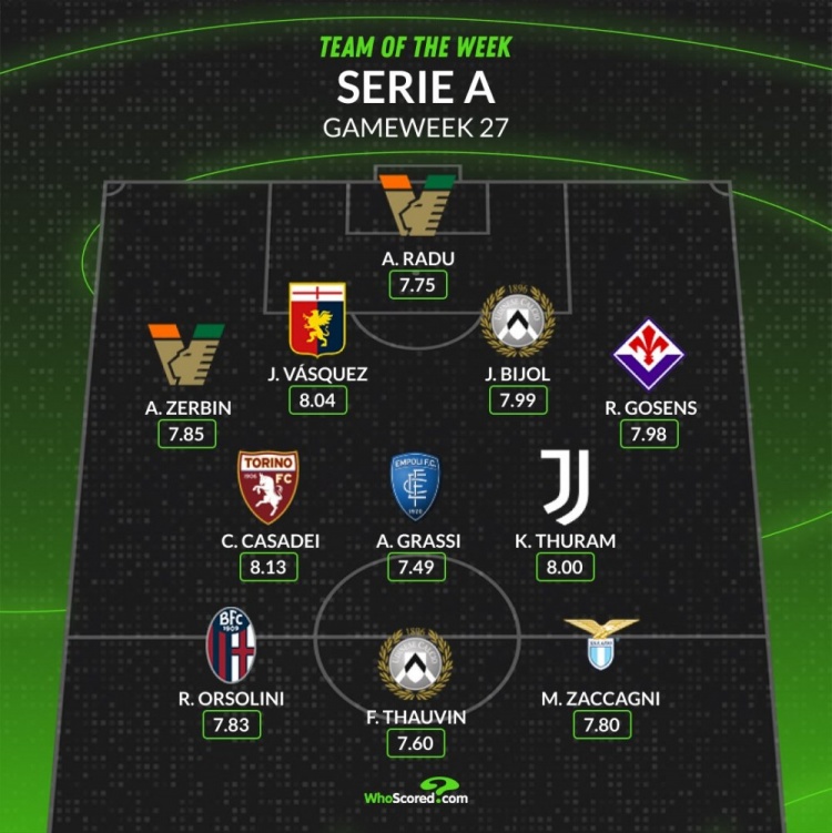 3月4日訊 意甲第27輪聯(lián)賽已經(jīng)完賽,whoscored也統(tǒng)計(jì)了本周意甲評(píng)分最佳陣容,凱夫倫-圖拉姆領(lǐng)銜。