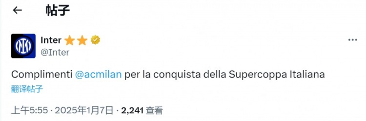 發(fā)布時(shí)間:2025年01月07日 06:51點(diǎn)擊:欄目:足球新聞 1月7日訊 在北京時(shí)間今天凌晨進(jìn)行的意大利超級杯決賽中,米蘭3-2逆轉(zhuǎn)國米,捧起冠軍獎(jiǎng)杯。賽后國米官方社媒發(fā)文:“祝賀米蘭贏得意大利超級杯。”近2場米蘭德比戰(zhàn),國米皆落敗。 除特別注明外,本站所有內(nèi)容均為九球直播整理排版,轉(zhuǎn)載請注明出處:國米官方社媒:祝賀米蘭贏得意大利超級杯 本文標(biāo)簽: 足球 意甲 AC米蘭 國際米蘭