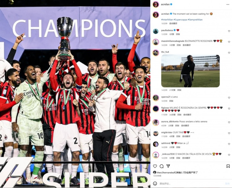 1月7日訊 今天凌晨,AC米蘭3-2逆轉(zhuǎn)擊敗國米奪得意大利超級(jí)杯冠軍,賽后,米蘭官方Instagram曬海報(bào)慶祝。